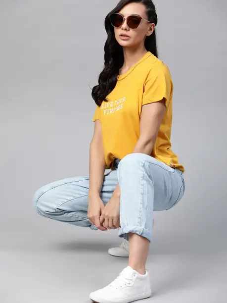 Women Typography Round Neck Pure Cotton Yellow T-Shirt